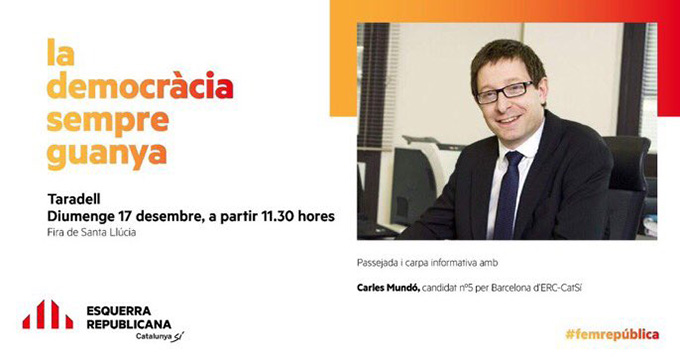 La seva presència està prevista a 2/4 de 12 del migdia en un acte amb intencionalitat electoral de cara als comicis catalans del proper 21 de desembre. Mundó visitarà la fira i també l’estand informatiu d’ERC. El polític gurbetà ocupa la posició número 5 dins la candidatura d’ERC a la demarcació de Barcelona.