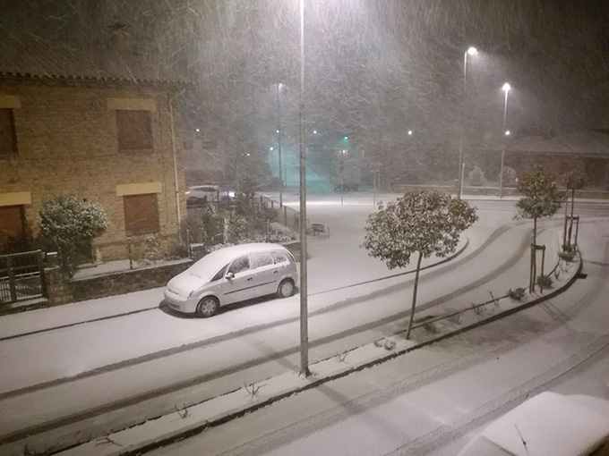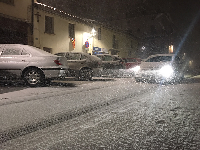 Neva amb intensitat a Taradell des de quarts de set de la tarda i de mica en mica va quedant tot blanc. La neu va acompanyada de vent i ja ha deixat els carrers ben blancs.